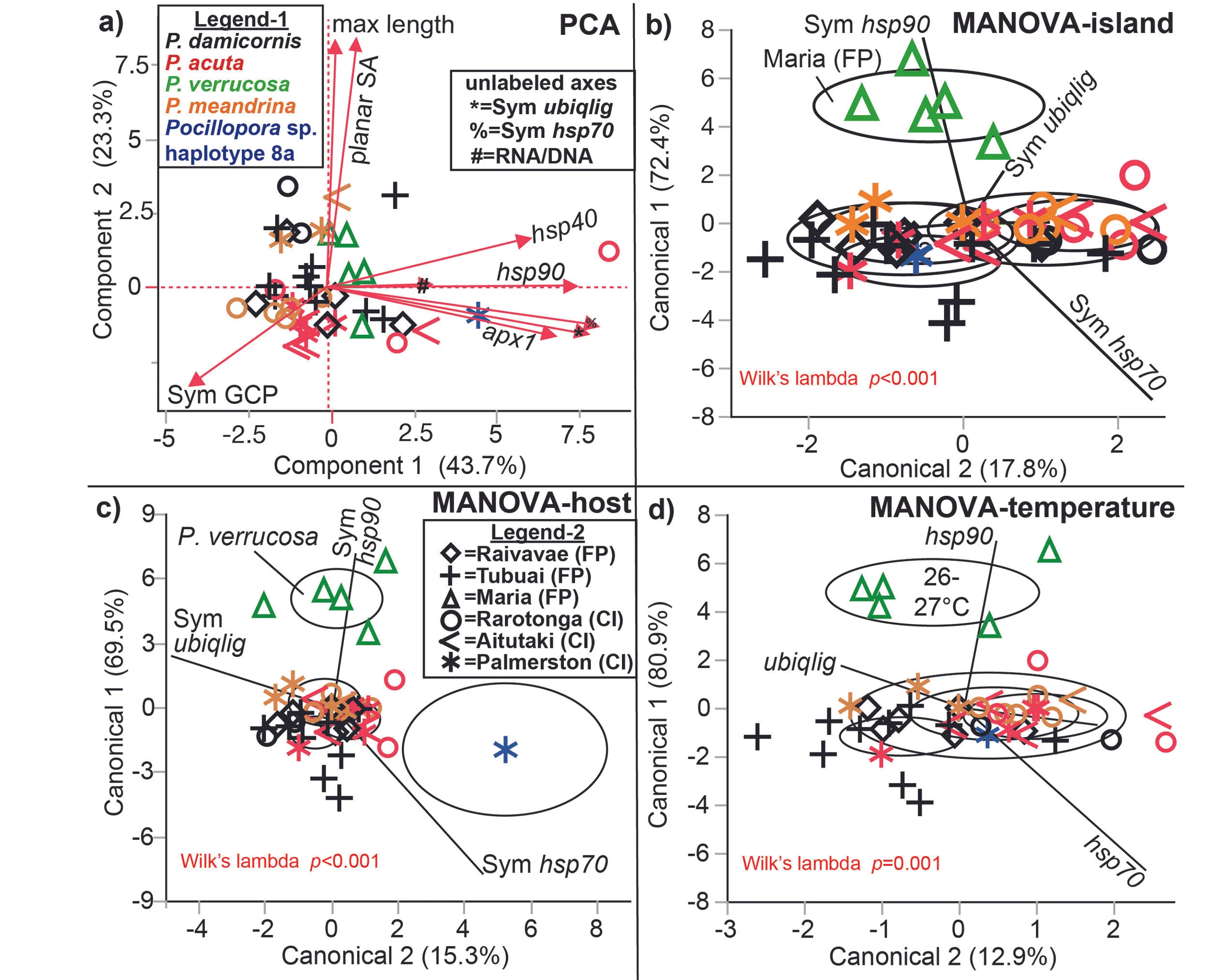 Principal components analysis (panel A) and canonical correlation analysis (CCA; labels b-d) of the Austral Islands+Cook Islands dataset. Red icons=Pocillopora acuta. Black icons=P. damicornis. Green icons=P. verrucosa. Orange icons=P. meandrina. Circles represent 95% confidence. Please see the associated manuscript (Mayfield et al. 2016, Platax) for additional details.